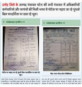 दमोह के जिला पंचायत एवं जनपद पंचायत में वेंडरों व ठेकेदारों द्वारा दिए गए सामान सप्लाई के बिल जो की सरकार की मंशा अनुसार पारदर्शिता लाने के उद्देश्य से पंचायत दर्पण पोर्टल पर चढ़ाना अनिवार्य हुआ है जिस पर ठेकेदार सरपंच व सचिव की मिली भगत से पंचायत में बेची गई सामग्री के बिल को धुंधला कर पोर्टल पर चढ़ाया जा रहा था जिस पर डेंजर भारत द्वारा पटेरा