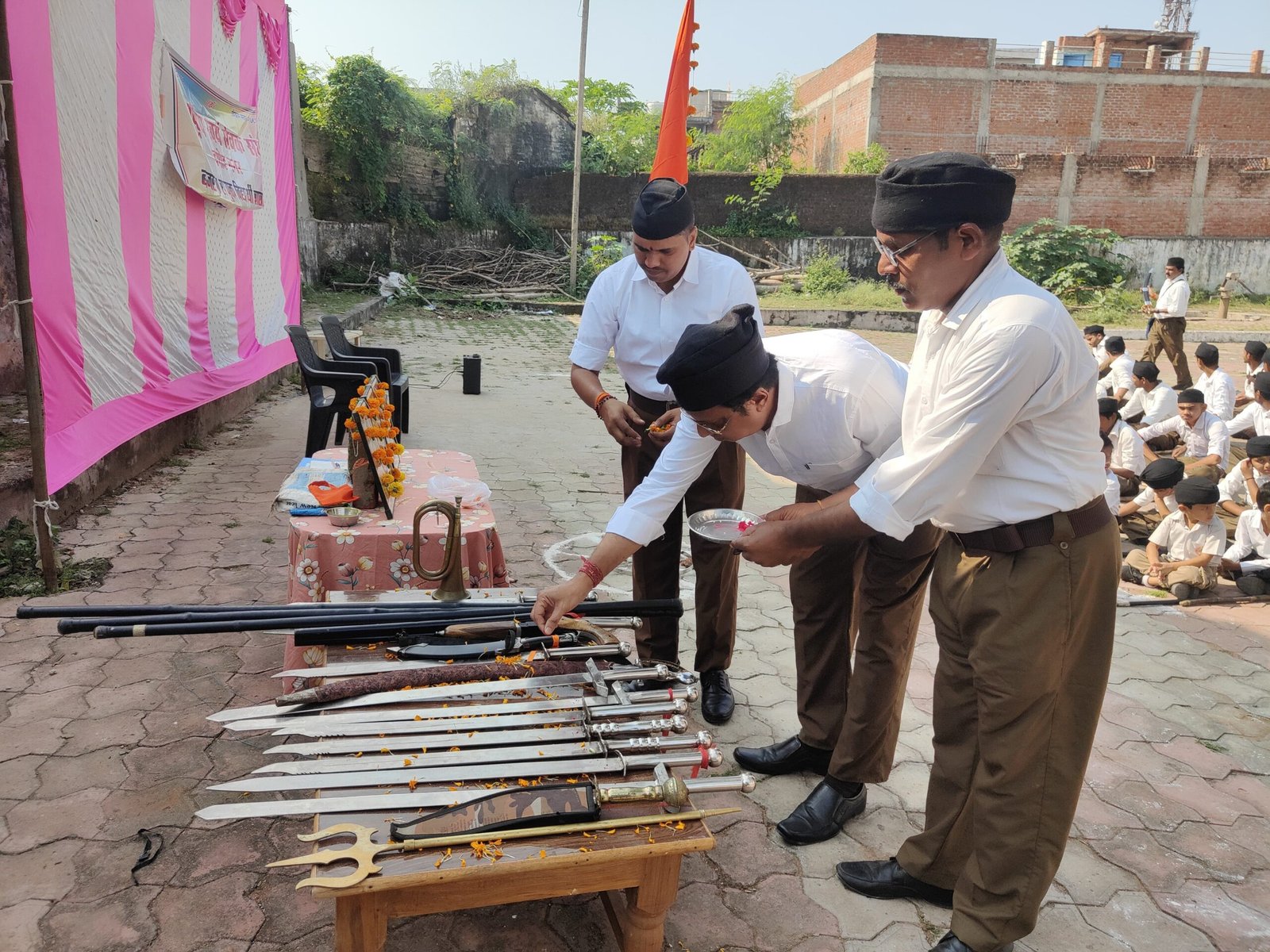 दमोह। विजयादशमी के पावन पर्व पर महाकाली बस्ती में राष्ट्रीय स्वयंसेवक संघ द्वारा शस्त्र पूजन एवं पथ संचलन का भव्य कार्यक्रम आयोजित किया गया। इस अवसर पर मुख्य अतिथि के रूप में श्रीमान राजीव जी अयाची एवं मुख्य वक्ता के रूप में दमोह जिला प्रचारक श्रीमान भईयन जी भाईसाब उपस्थित रहे। कार्यक्रम का शुभारंभ पारंपरिक विधि-विधान से शस्त्र पूजन के साथ किया गया।