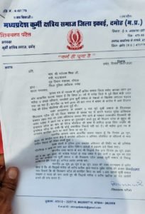 ज्ञापन पत्र के माध्यम से कुर्मी क्षत्रिय समाज जिला दमोह आपका ध्यान इस ओर आकर्षित कराना चाहती है कि विगत 01 वर्ष से दमोह जिले में पूर्व वित्त मंत्री जयंत मलैया व उनके परिजनो, समर्थकों द्वारा कुर्मी समाज के नेताओं के खिलाफ लगातार षडयंत्र रचा जा रहा हैं। माननीय 15 मार्च 2019 को हटा नगर में बसपा से कांग्रेस में आये दिवगंत नेता श्री देवेन्द्र चैरसिया की हत्या हुई थी।