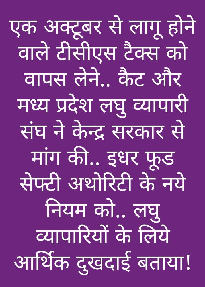 एक अक्टूबर से लागू होने वाले टीसीएस टैक्स को वापस लेने.. कैट और मध्य प्रदेश लघु व्यापारी संघ ने केन्द्र सरकार से मांग की.. इधर फूड सेफ्टी अथोरिटी के नये नियम को.. लघु व्यापारियों के लिये आर्थिक दुखदाई बताया!