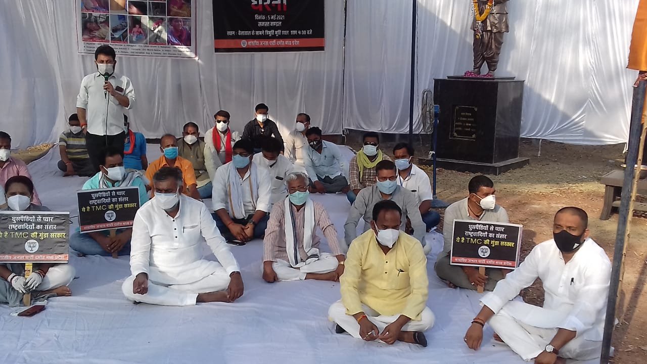 दमोह। भारतीय जनता पार्टी के राष्ट्रीय एवं प्रदेश नेतृत्व के निर्देषानुसार जिले के सभी 22 संगठनात्मक मंडलो में बंगाल की ममता सरकार के उपद्रवी तत्वो द्वारा भाजपा के कार्यकर्ताओ पर लगातार किए जा रहे हमलो एवं महिलाओ पर हुए अत्याचार के विरोध में त्रिमूर्ति बेलाताल के समीप कार्यकर्ताओ ने सरकार की कोरोना गाईडलाईन का पालन करते हुए धरना दिया। इस अवसर पर केंद्रीय मंत्री पहलाद पटेल वेयरहाउसिंग कारपोरेशन के चेयरमैन राहुल सिंह जिला पंचायत के अध्यक्ष शिवचरण पटेल हटा विधायक पी एल तंतुवाय नगर पालिका अध्यक्ष मालती असाटी महिला मोर्चा की प्रदेश कार्यसमिति सदस्य मंत्री कविता राय, किसान मोर्चा के जिलाध्यक्ष गोपाल पटैल, भाजपा नेता वृज गर्ग जिला महामंत्री रमन खत्री जिला मीडिया प्रभारी संजय सेन, मंडल अध्यक्ष मनीष तिवारी, संतोष रोहित, पवन तिवारी ,राघवेंद्र सिंह परिहार ,सत्येंद्र साहू, मनीष सोनी ,सह मीडिया प्रभारी मौंटी रैकवार,चंदू उपाध्याय ,अनुपम सोनी, प्रीतम चौकसे,भरत यादव, राजू राय,अमन राय ,वैभव खरे आदि उपस्थित थे। धरना का संचालन सतीश तिवारी एव आभार मौंटी रेकवार ने किया। इस अवसर पर केंद्रीय मंत्री प्रहलाद पटेल, जिला अध्यक्ष प्रीतम सिंह, वेयरहाउसिंग कॉरपोरेशन के अध्यक्ष राहुल सिंह ,महिला नेत्री श्रीमती कविता राय, जिला पंचायत अध्यक्ष शिवचरण पटेल विधायक पी एल तंतुबाय ,रमन खत्री, गोपाल पटैल आदि ने धरना को संबोधित करते हुए कहा कि कोरोना महामारी के संकट की घड़ी में जहां मानव समाज एक-दूसरे की जान बचाने के लिए कार्यरत है। वहीं पश्चिम बंगाल में तृणमूल कांग्रेस के उपद्रवी तत्व लगातार भाजपा के कार्यकर्ताओं पर आक्रमण और हिंसा कर रहे हैं। कई कार्यकर्ताओं की चुनाव के उपरांत हत्या कर दी गई। हजारों की संख्या में कार्यकर्ता घायल हैं। पार्टी के कई कार्यालयों में तोड़ फोड़ और आगजनी की घटना हो रही है। यह लोकतंत्र का काला अध्याय तृणमूल कांग्रेस द्वारा लिखा जा रहा है।