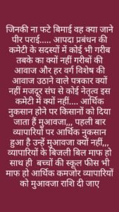 जिनकी ना फटे बिमाई वह क्या जाने पीर पराई….. आपदा प्रबंधन की कमेटी के सदस्यों में कोई भी गरीब तबके का क्यों नहीं गरीबों की आवाज और हर वर्ग विशेष की आवाज उठाने वाले पत्रकार क्यों नहीं मजदूर संघ से कोई नेतृत्व इस कमेटी में क्यों नहीं…. आर्थिक नुकसान होने पर किसानों को दिया जाता हैं मुआवजा,,, पहली बार व्यापारियों पर आर्थिक नुकसान हुआ है उन्हें मुआवजा क्यों नहीं,,, व्यापारियों के बिजली बिल माफ हो साथ ही बच्चों की स्कूल फीस भी माफ हो आर्थिक कमजोर व्यापारियों को मुआवजा राशि दी जाए??????????