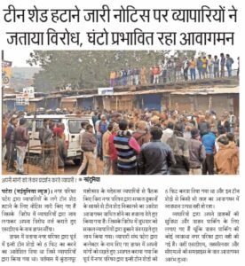 दमोह जिले की ग्राम पटेरा मैं अतिक्रमण हटाने को लेकर व्यापारियों ने किया विरोध बरसात और धूप से बचने के लिए व्यापारियों के टीन सेट पर प्रशासन की गाज गिराए जाने से व्यापारी परेशान आपको बता दें कि कल ही कुंडलपुर क्षेत्र में सूक्ष्म और लघु माध्यम उद्यम प्रोघोगिकी मंत्री भी उस समय पटेरा ब्लॉक के कुंडलपुर क्षेत्र में थे शायद यही वजह थी कि व्यापारियों के आंदोलन को मात्र 2 घंटे में समझा-बुझाकर शांत कर दिया गया!