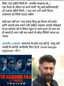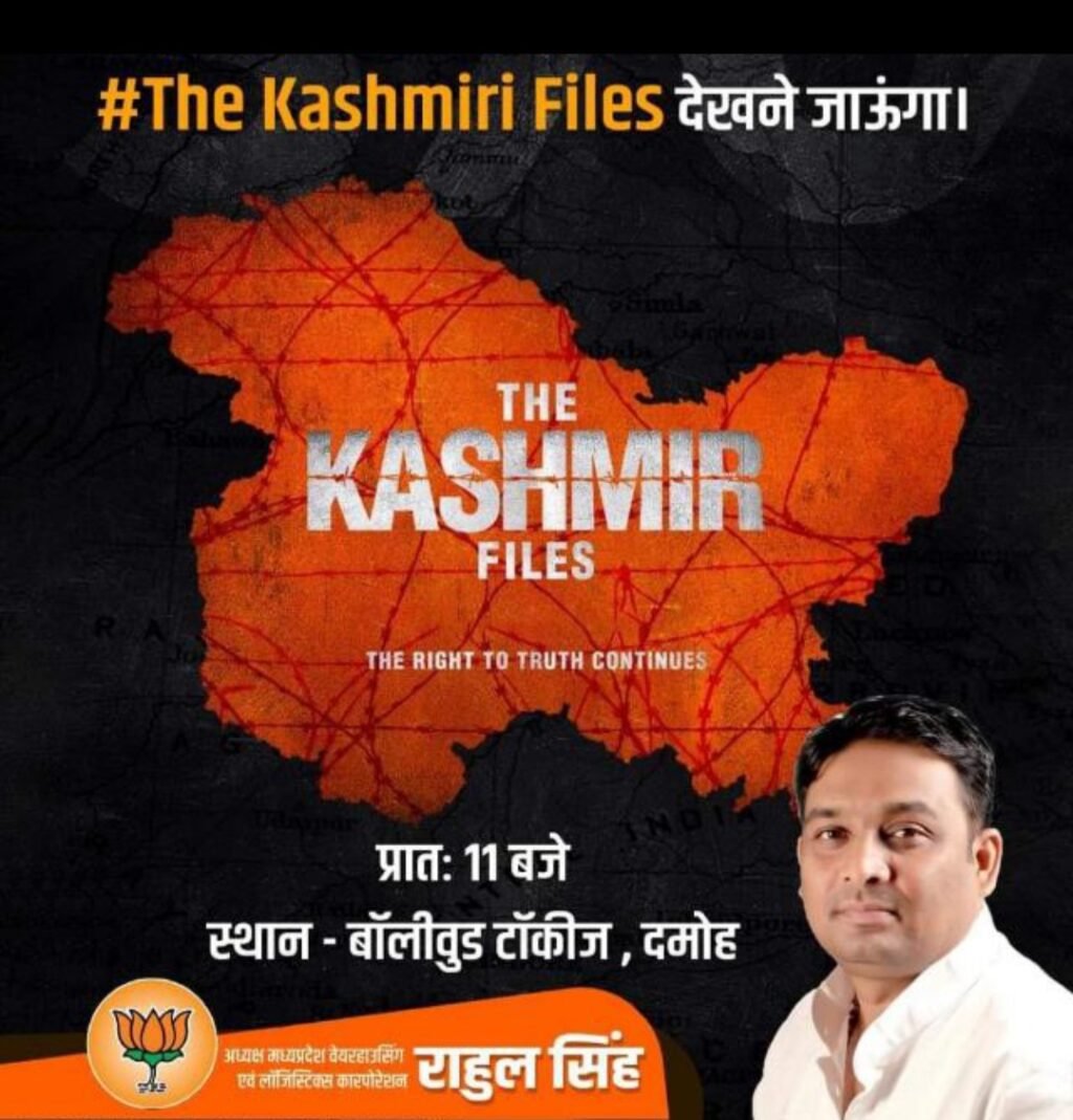कश्मीर की सच्चाई पर आधारित हिंदी फिल्म *”द कश्मीर फाइल्स”* माननीय कैबिनेट मंत्री राहुल सिंह (भैया) अध्यक्ष MPWLC, के नेतृत्व में एवं भाजपा जिला अध्यक्ष प्रीतम सिंह की अध्यक्षता में दिनांक 17 मार्च, दिन गुरुवार को सुबह 11:00 बजे से बॉलीवुड टॉकीज दमोह में *पूरा-शो* बुक किया गया है ! जिसमें आप सभी सादर आमंत्रित है ।