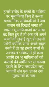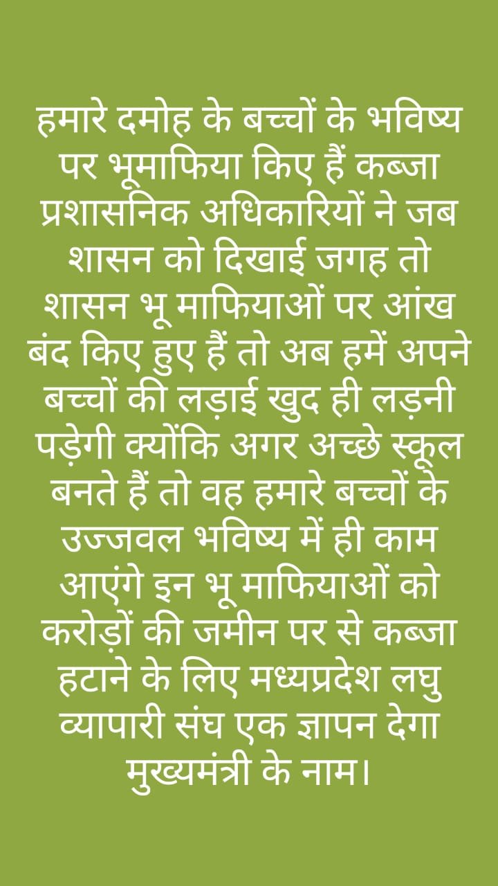 अब प्रशासन ने तो अपनी भूमिका पूरी तरह निभा दी और शासन को बता दिया कि जबलपुर सागर बाईपास पर 10 एकड़ सरकारी भूमि है जिस पर गरीब बच्चों के लिए अच्छे स्कूल बन सकते हैं लेकिन अब बात आती है कि उस अतिक्रमण को भला कौन हटाएगा जिस पर राजनीतिक संरक्षण प्राप्त नेताओं का कब्जा है ऐसे में लगता है कि प्रशासनिक अधिकारियों पर ही गाज ना गिर जाए। यह सभी बातें सामने आने के बाद मध्य प्रदेश लघु व्यापारी संघ के प्रदेश अध्यक्ष तनुज पाराशर ने एक मुहिम चलाई हुई है कि अपने बच्चों के भविष्य के लिए बन रहे अच्छे स्कूल पर अतिक्रमण धारियों के कब्जे हटाए जाएं अन्यथा मध्य प्रदेश लघु व्यापारी संघ इस पर मुख्यमंत्री को ज्ञापन के साथ अनेक आंदोलन करने के लिए विवश होगा