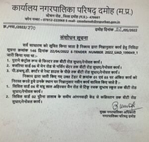 जाएगा अब देखना होगा कि कब तक नगर पालिका में हुए ईटेंडरिंग के भ्रष्टाचार को लेकर विधायक अजय टंडन ने कहा अगर जिला प्रशासन ने इस ओर ध्यान नहीं दिया तो यह बात अदालत तक जाएगी। आप सभी जानते हैं कि कोरोनाकाल के चक्कर में नगर पालिका चुनाव नहीं हुए इस कारण से दमोह नगर पालिका अभी कलेक्टर के अधीन है इस मामले में अगर कलेक्टर ने संज्ञान नहीं लिया तो वह दिन दूर नहीं जब दमोह कलेक्टर भी अदालत में पेशी करते नजर आएंगे। क्योंकि नगर पालिका द्वारा किए गए भ्रष्टाचार पर पर्दा डालने के लिए इसी सड़क की पुनः निविदा जारी जारी की गई है जो कि पहले निर्माण कार्य के लिए था अब रिपेयरिंग कार्य बना दिया गया है इससे यह स्पष्ट नजर आता है कि नगरपालिका ने ईटेंडरिंग में भ्रष्टाचार किया है और अपने काले कारनामे छिपाने के लिए पुनः संशोधित निविदा जारी की है जिसमें 23 तारीख की डेट है जबकि समाचार आने के बाद यह जारी की गई याने की अपने ही किए कारनामे पर पोता फेरने की कोशिश नजर आ रही है। अगर यह मामला अदालत में जाता है तो दूध का दूध और पानी का पानी हो जाएगा और नगर पालिका के सभी भ्रष्टाचारी जेल जाएंगे।