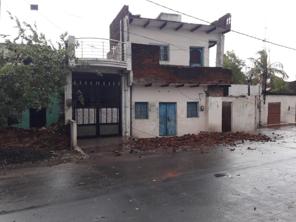 धर्मपुरा रोड़ के किनारे मंदिर के आगे मकान के ऊपर की दिवाल गिरी।