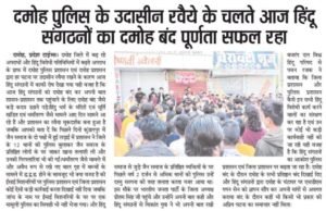 दमोह में इन दिनों अपराध चरम सीमा पर पहुंच चुके हैं और जिम्मेदार मोन बैठे हैं जबकि जनता परेशान है यही वजह है कि कल हिंदू संगठनों ने पुलिस के ढुलमुल रवैया और उदासीनता के चलते दमोह बंद जैसे कड़े फैसले लेते हुए जिला प्रशासन एवं पुलिस प्रशासन को चेत जाने के लिए दमोह बंद कराया था। बीती रात दमोह की कसाई मंडी में मुस्लिम बहुल एवं हिंदुओं के घर होने के कारण वहां पर एक अस्थाई चौकी बनाई गई है जिसमें एस एफ पुलिस की ड्यूटी 24 घंटे रहती है