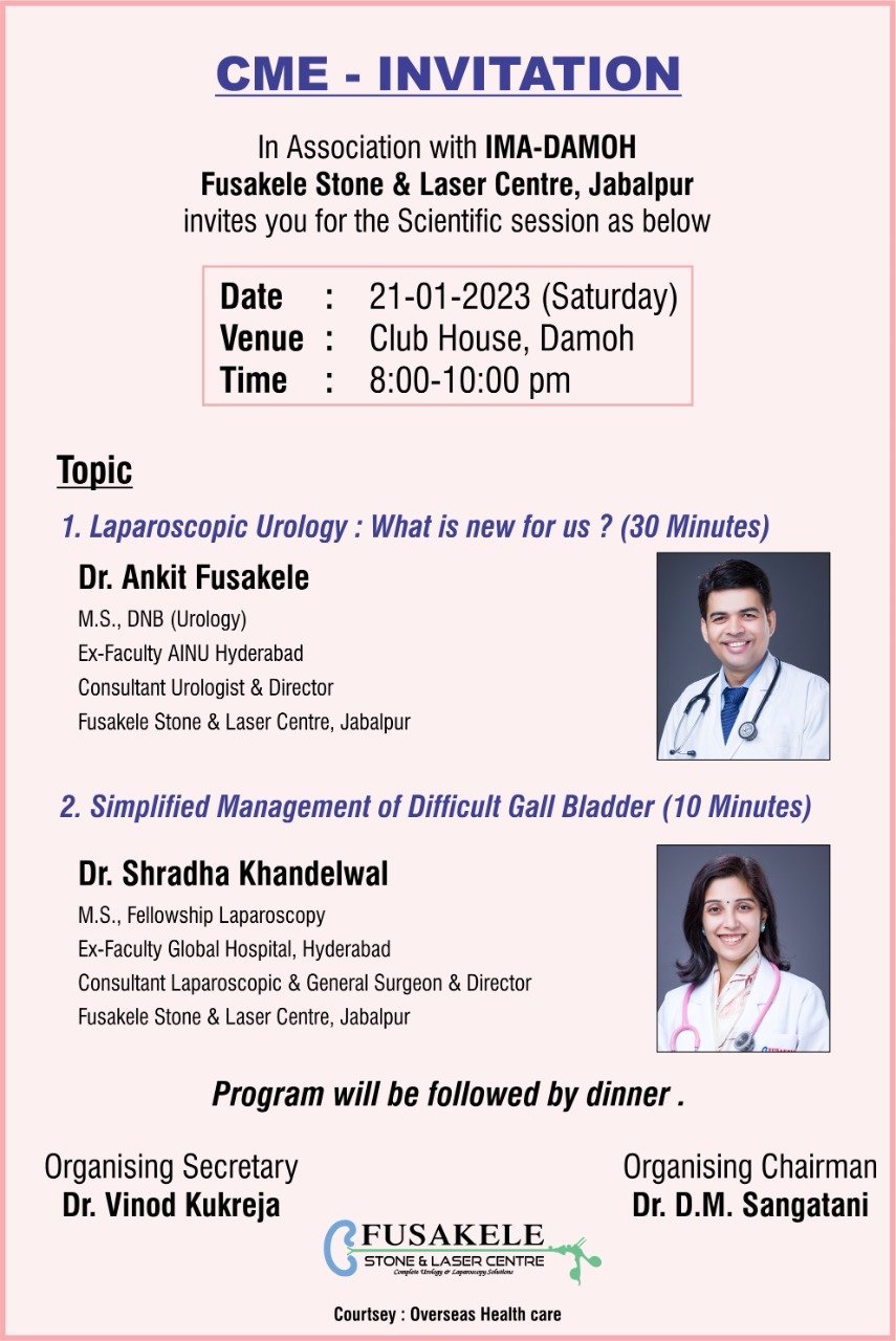 *इंडियन मेडिकल एसोसिएशन* दमोह एवं *फुसकेले स्टोन एंड लेजर सेंटर* के संयुक्त तत्वावधान में आज दिनाँक 21/01/2023 (शनिवार) को विशेष व्याख्यान आयोजित किया जा रहा हैं |